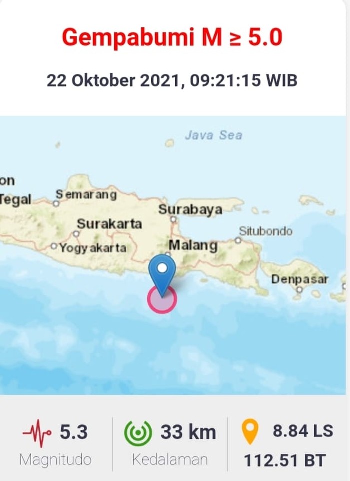Jakarta-malang Gempa tektonik berkekuatan magnitudo 51 mengguncang wilayah selatan Jawa Timur Jumat 22102021 pukul 0921 WIB. 1 day agoGempa di selatan Jawa lainnya hari ini Jumat 22 Oktober 2021 terjadi di Kabupaten Malang jawa Timur. BMKG menyebut gempa yang terjadi berkekuatan 67 SR.